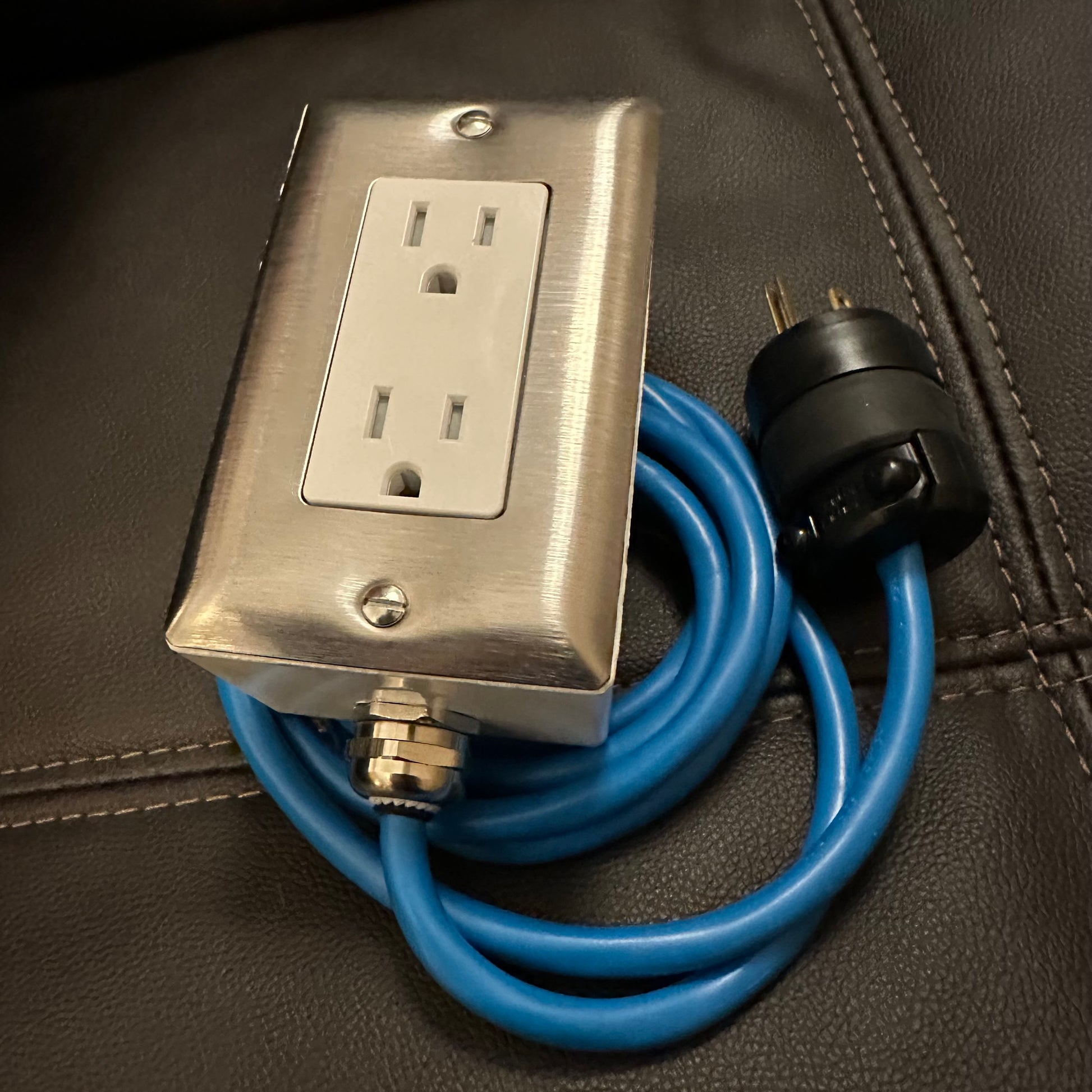 The Plug Box Standard features twin 120-Volt outlets to give you handy access to power on your desktop, end table, or beside your couch. Make a statement with the bright blue cord, heavy duty plug, white metal enclosure, and stainless cable cover plate and cable gland. This Plug Box is built to look cool, and work awesome!