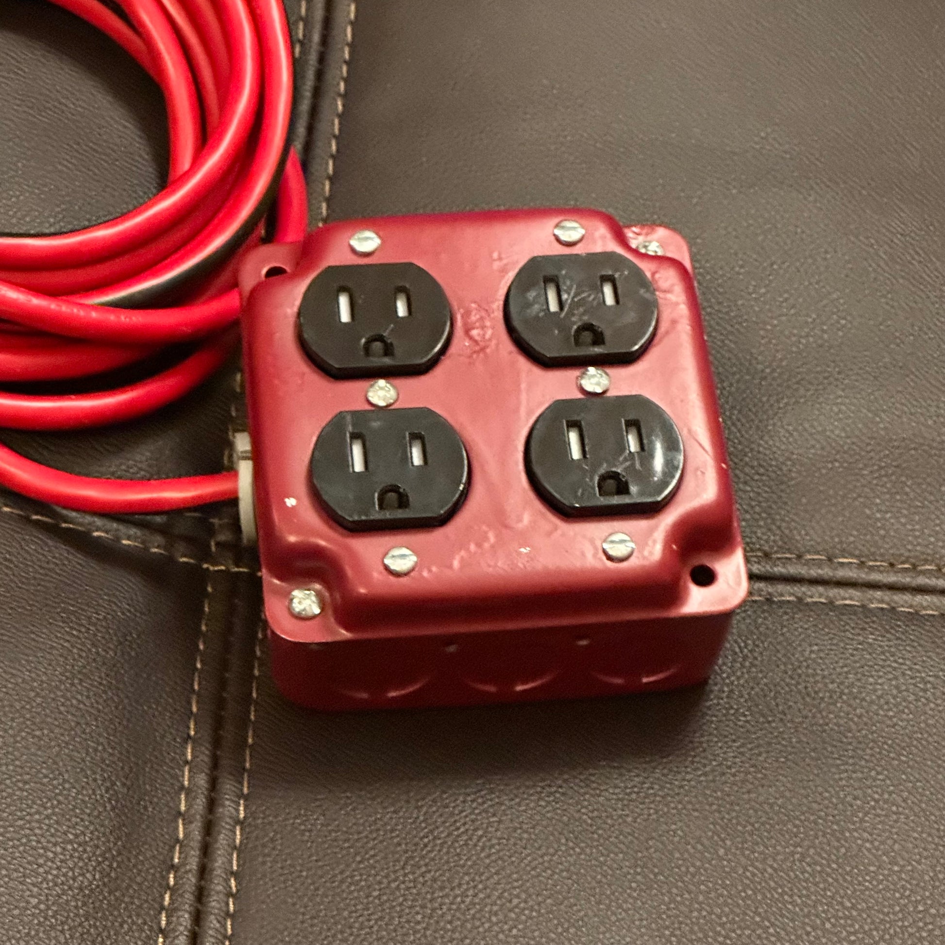 The Garage Quad Outlet Plug Box features a drawn metal enclosure with 4 plugs for 120-volt appliances, a heavy-duty cord, and a locking cable gland. This is perfect for your garage and is very heavy duty.